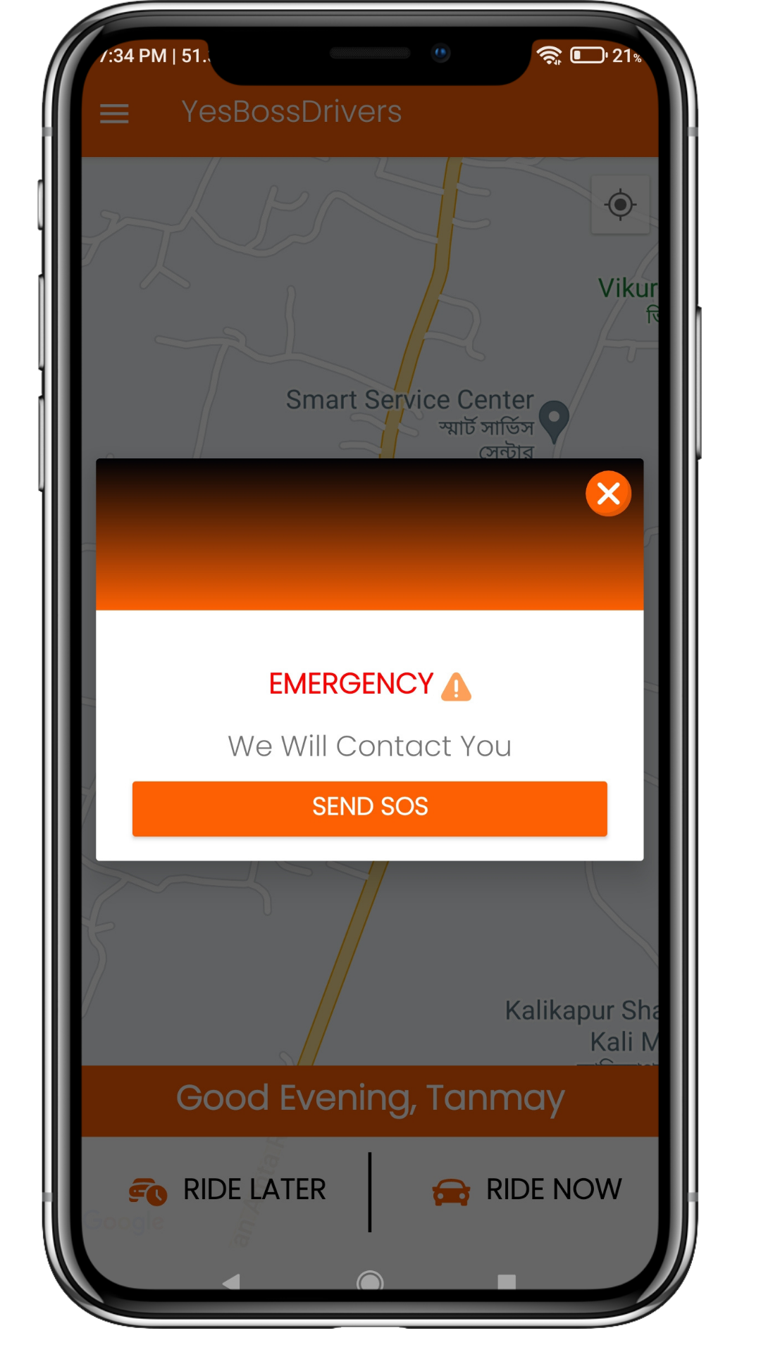Passenger will click on an sos button, and their location details with a message will be sent to his saved contact for emergency.